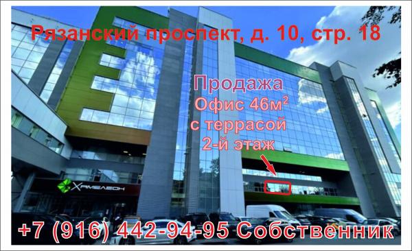 Продается офис в БЦ класса A "Хамелеон" на 2-м этаже общей площадью 46 м. кв. + открытая терраса 16 м.кв. Современный ремонт. Центральное кондиционирование (2 фанкойла). Доступ в помещение 7х24. Приточно-вытяжная вентиляция. Автоматическая пожарная сигнализация, видео наблюдение, контроль и управление доступом. Современные инженерные системы, круглосуточный банкомат, электронная система пропуска на территорию, круглосуточная охрана. Современный деловой центр, расположенный в районе станций метро Рязанский проспект (Рязанский проспект, д. 10, с. 18). В непосредственной близости станция метро Стахановская. Стоимость продажи 13133000 рублей. Торг возможен. Удобный выезд на Рязанский проспект и прямой доступ к МКАД и ТТК. Фасад здания нестандартный и креативный. Внутреннее пространство офиса спроектировано грамотно и максимально удобно. Помещение готово к въезду. Инженерное и коммуникационное обеспечение БЦ Хамелеон соответствует европейским стандартам качества. На территории делового комплекса есть ресторан, кафе-бар, отделение банка, магазин. Тел.: +7 (916) 442-94-95 Собственник.