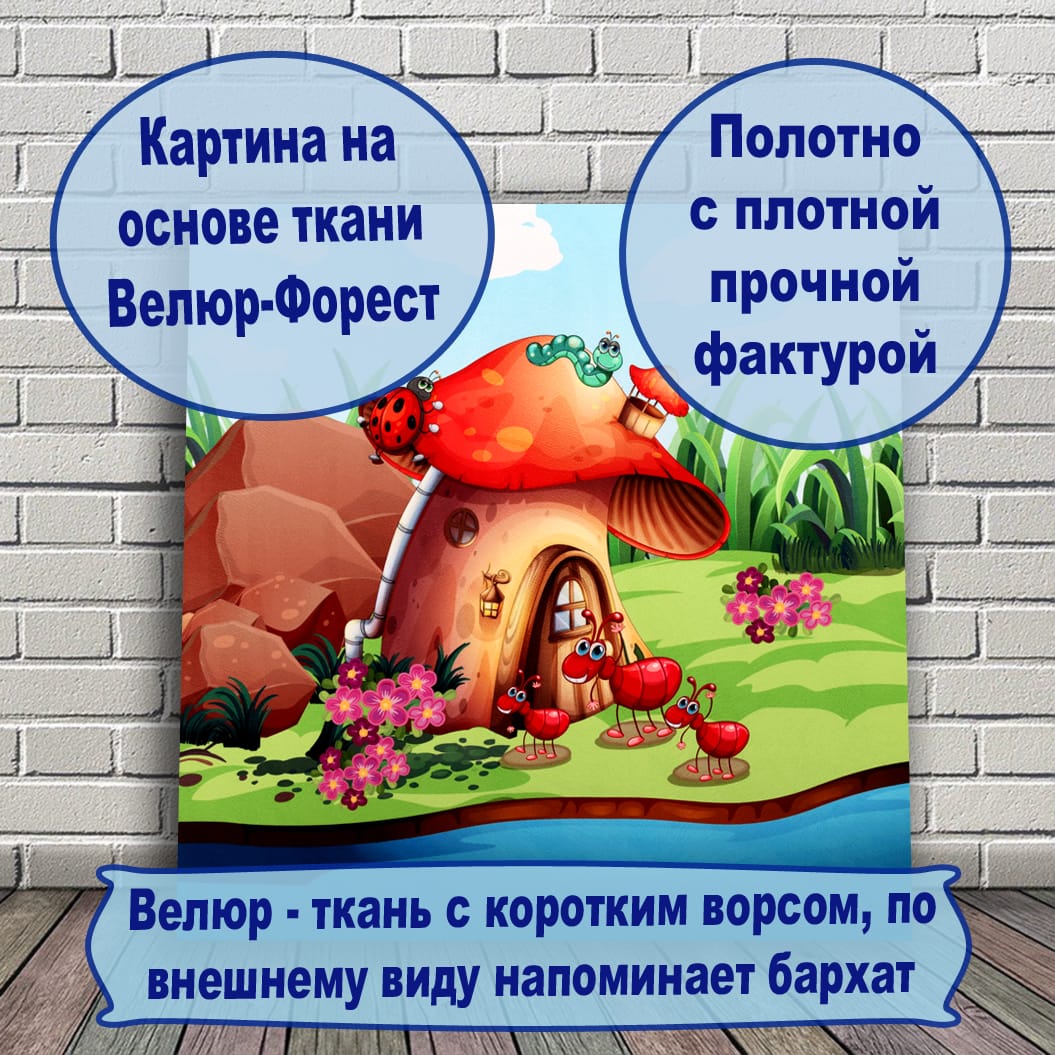 Интерьерная картина "Гриб-теремок" - изготовлена на основе велюровой ткани Форест с коротким ворсом и оригинальной текстурой, что придаёт картине особый шарм. Ткань плотная, мягкая и приятная на ощупь. Мягкая с приятными тактильными ощущениями ткань, изменит представление об окружающих Вас деталях интерьера.