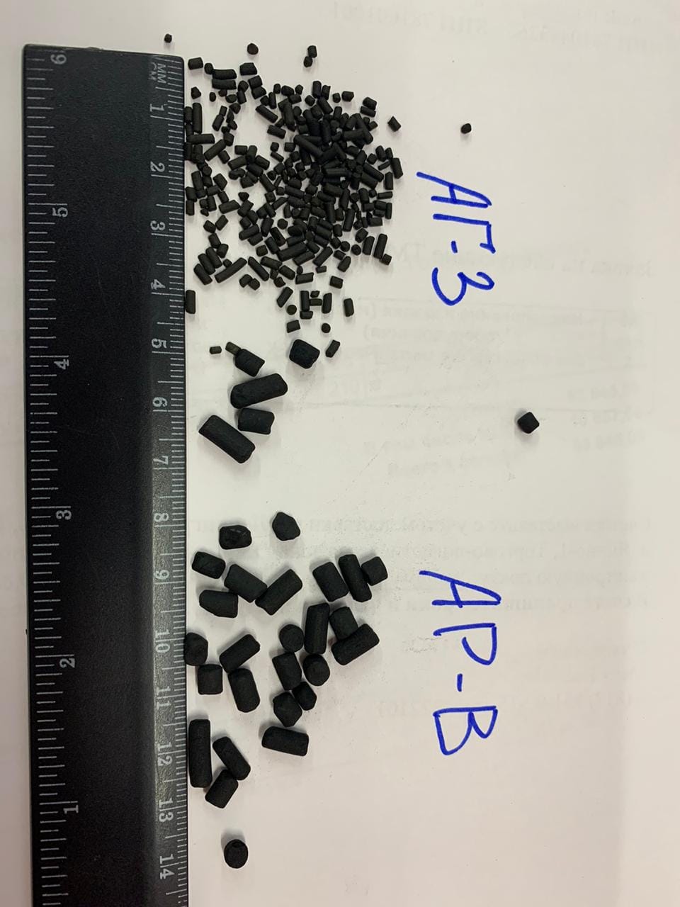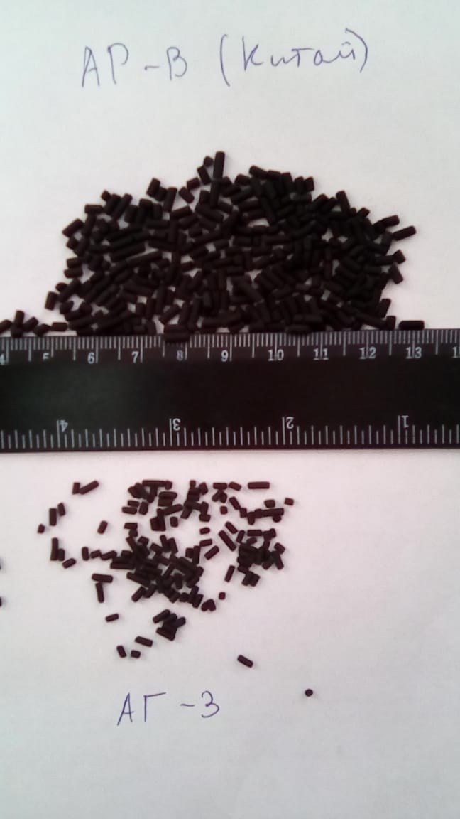 "Гранулированный рекуперационный активный уголь АР-В". Наименование показателя Норма Внешний вид угля активного АР-В Цилиндрические гранулы темно-серого или черного цвета Основной размер частиц, мм 2, 8 - 5, 0 Прочность гранул на истирание, %, не менее 75 Насыпная плотность, г/дм3, не более 600 Равновесная активность по толуолу, г/дм3, не менее 110 Массовая доля влаги, %, не более 10