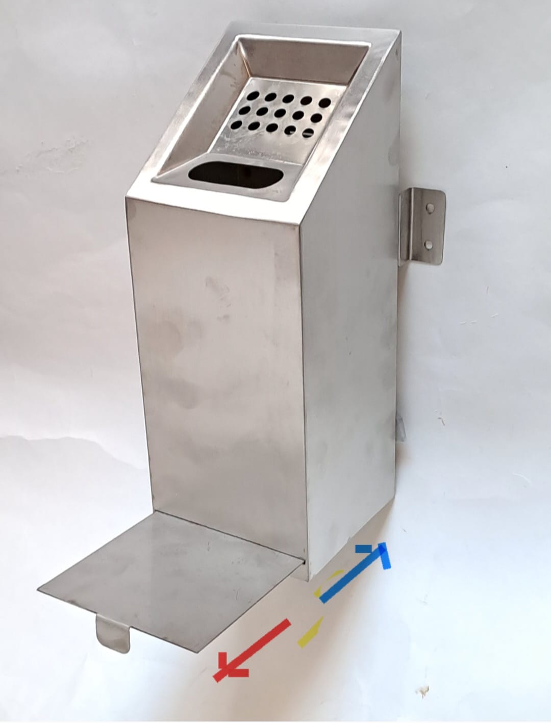 Материал -- нержавейка толщиной 0,6мм Крепится к стене на пластину шириной 4 см ( с каждой стороны по 2 отверстия d 6 мм) Крепёжная пластина приварена к задней стенке корпуса и находится на расстоянии от его верхней точки --- 8см , от его нижней точки --- 14 см. Для удаления мусора из пепельницы следует выдвинуть пластину днища "на себя". Продаётся поштучно Возможны оптовые поставки по индивидуальным размерам и системе крепления( например как на последнем фото : крепление вертикальным " насаживанием" на 2 отверстия прямоугольника приваренного к задней стенке )
