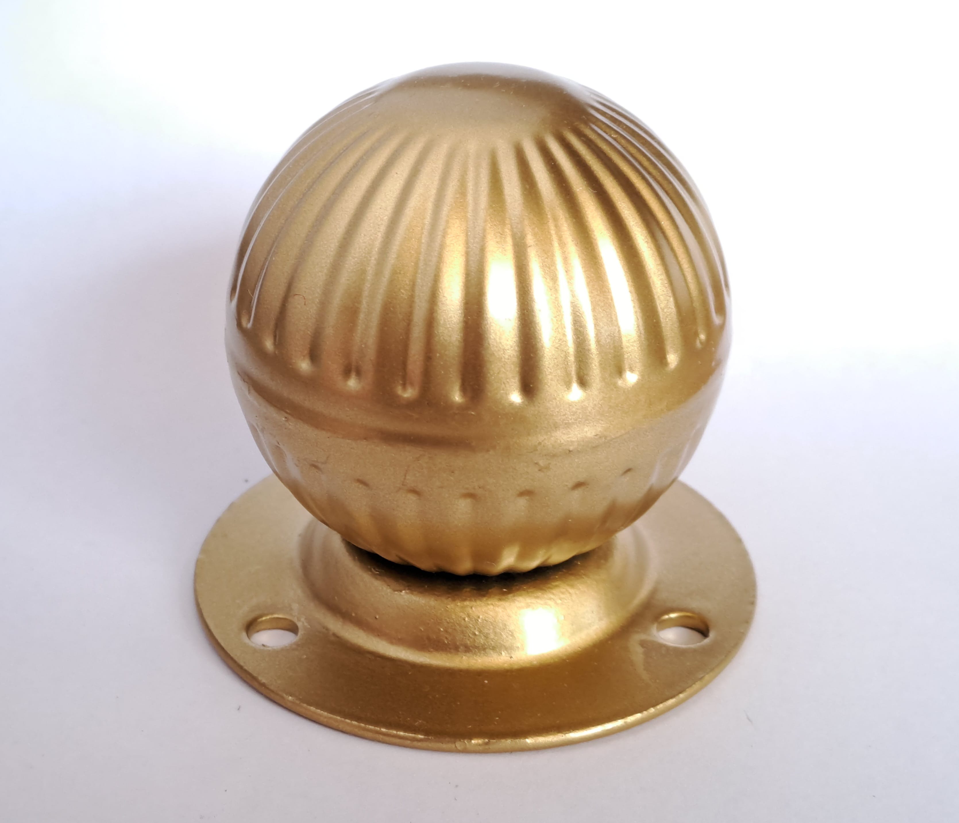 Диаметр рукоятки 60мм Ручка односторонняя .Неповоротная .Рукоятка приварена к розетке основания . Рукоятка в форме "шара" полая , анодированная в цвет "матовый золотистый".. Диаметр основания розетки 70мм либо 90мм ( с количеством отверстий для крепления -- 3шт либо 4 шт) высота торца розетки у основания 2мм , общая высота от двери до верхушки рукоятки 66мм Устанавливаются на межкомнатные двери , входные двери подъездов..