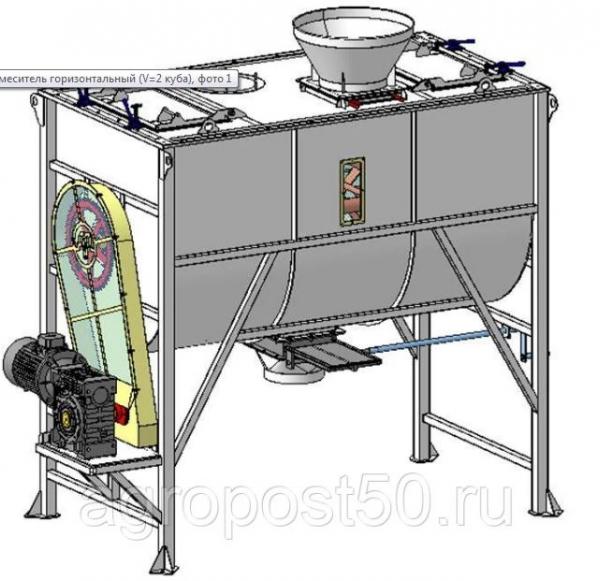 Комбикормовый завод (2 т) + с горизонтальным смесителем СГ Производительность: рассыпной корм без сена — до 2 тонн в час. Рассыпной корм с добавлением сена – до 1 тонны в час Ориентировочный Вариант Комплектации: 1 Дробилка пневматическая молотковая ДПМ-22 (с Общим Пультом Управления на Смеситель и Шнек) 1 … 22 кВт 1 Бункер-Накопитель + Успокоитель БПН- с Аспирацией 1 … — 3 Смеситель Горизонтальный СГ-8 (V=1 м. куб.) 1 … __ кВт 4 Весовой Дозатор Электронный ДУЭТ (4 тензодатчика), для Смесителя СГ- 1 … 220В 5 Шнековый Транспортер ТСШ-150 (_ м) 1 … __ кВт Обслуживающий персонал: 1 чел. Гарантия: 1 год Срок поставки: 10 дней Общее описание: зерно, по гибкому шлангу, поступает в дробилку. На входе в дробильную камеру установлен сепаратор, который отделяет от зерна камни и металлические примеси. После измельчения продукт попадает в накопитель, дозируется и отгружается в смеситель. Накопитель устанавливается на весах со встроенным звуковым сигналом, что позволяет точно отмерять каждый компонент. Смеситель снабжен независимым бункером для компонентов, не требующих дробления (отруби, премиксы). Выгрузка готового продукта осуществляется шнеком через нижний люк. ЗВОНИТЕ ! — Предложим Оптимальный Варианты Комплектации Мини-Завода по Производительности и Комплектации: Основные Габаритные размеры линии: 5*4*5 м Видео работы смесителя СГ: Видео выгрузки горизонтального смесителя СГ:Производитель: Собственное производство