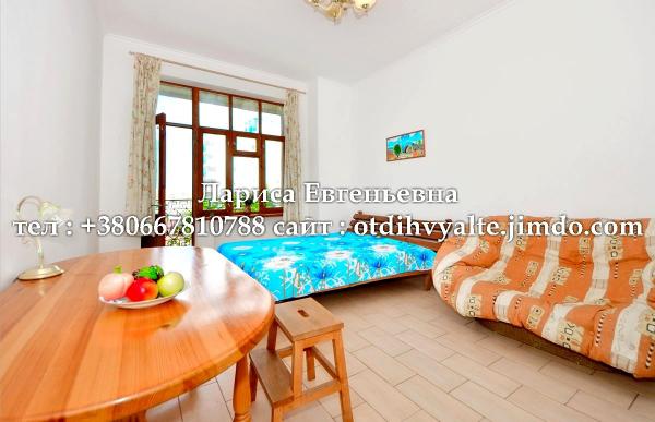 1 комн. квартира до 3 человек, ул. К. Маркса 11, набережная Ялты, до пляжа 4 мин. пешком, двухспальная кровать и диван, тв кабельное, Wi-Fi, оборудованная кухня, газ плита, микроволновка, двухконтурный котел, гор. вода круглосуточно, стиральная машина, кондиционер, парковка машины под окно, или на охраняемой стоянке. возможен Цены сезонные-от1500-5000р.сут. На ваши даты цену уточняйте по т+7978-532-7932 -есть Ватсап и телеграм. действующая цена на текущий месяц на моём сайте, возможности торга по телефону или E-mail, цены на праздники уточняйте, другие варианты жилья на сайте: Ялта Лариса Евгеньевна, адрес моего сайта смотри на водяной строке на фотографиях квартиры.
