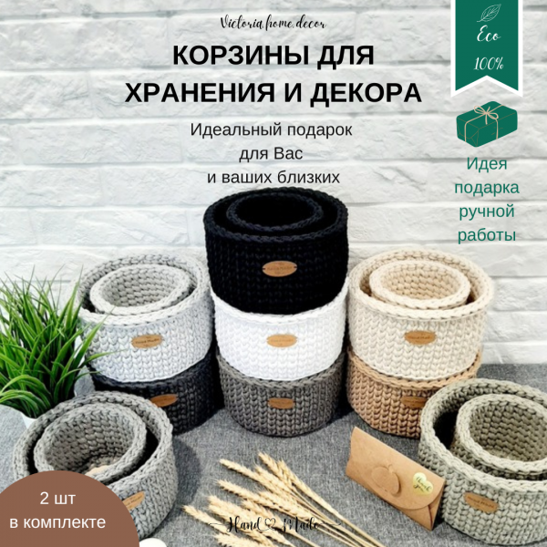 Доставка по всей России. Посмотреть актуальную цену и заказать можно на сайте. Ищите оригинальный и необычный подарок? Да такой, чтоб впечатлить и удивить? Тогда набор стильных органайзеров - это то, что Вам нужно. Вязаные корзины ручной работы - это уже тренд, полезный и стильный аксессуар для порядка и декора интерьера. Идеально подходят для хранения самых разнообразных вещей, помогая Вам поддерживать уют в доме. Подобные корзины не найти в магазинах, ведь каждая из них уникальна и неповторима. И как показала практика, их очень любят дарить и получать в качестве подарка на День рождение, День матери, Рождество и Новый год, 8 марта, новоселье или просто, как комплимент. Набор вязаных корзин - идеальный подарок маме, бабушке, сестре, любимой девушке, подруге, коллеге, учителю или воспитателю. В наборе 2 квадратные корзины. Цвет на выбор. Длина/ширина большой: 16 см, маленькой: 11 см. Высота большой: 8 см, маленькой 7 см. Плотные, прекрасно держат форму. Состав: экологичный регенерированный хлопок, шлифованное гладкое донышко из березовой фанеры. Обратите внимание, что каждая корзина связана вручную, и допустима погрешность в +/- 0,5 см. Набор упакован с любовью и вниманием к деталям, что делает его идеальным подарком для любого случая.